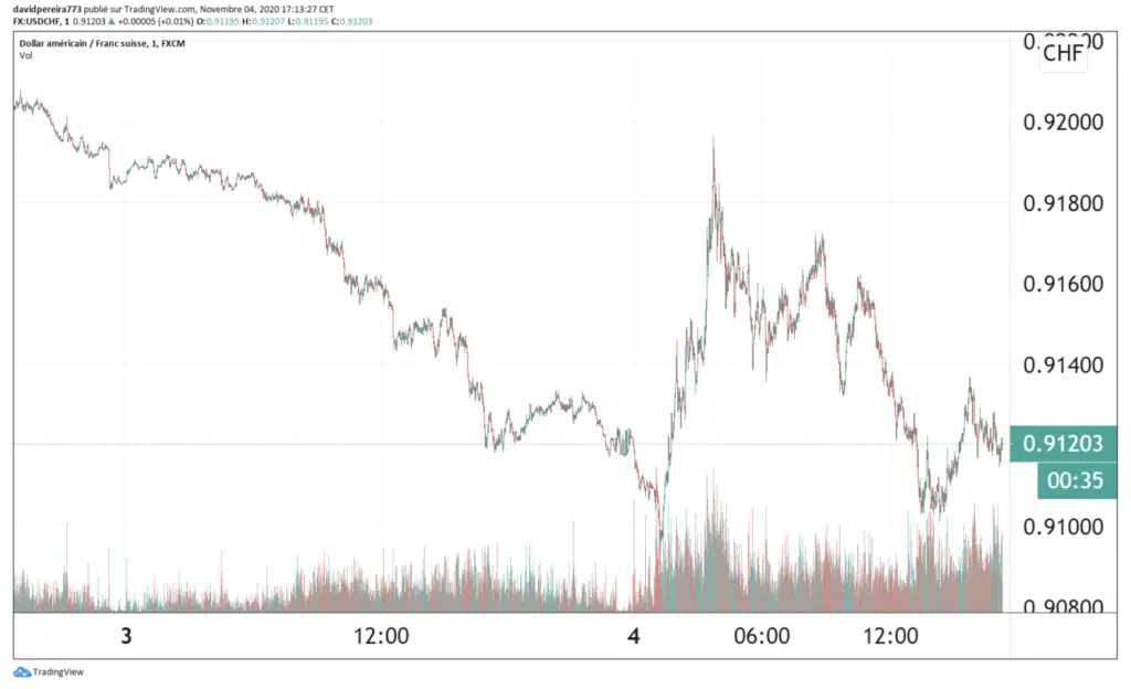 La paire EUR/CHF a subi la même tendance entre la nuit du 3 au 4 novembre pour les mêmes raisons. La paire était sur une base de 1.0680. Elle est montée à 1.0710 puis a chuté à 1.0650. Comme vous pouvez vous en apercevoir, la paire reste très volatile depuis le 3 novembre et la paire s’échange actuellement à 1.0680.