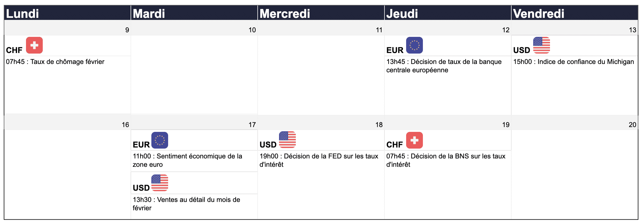 Le Covid-19 continue de faire des ravages en Europe et dans le monde avec plus de 100’000 cas confirmés. L’Italie est devenue le pays le plus touché après la Chine avec plus de 7’000 cas et 366 décès dimanche 8 mars. Le gouvernement italien a appliqué des mesures draconiennes afin de pallier l’expansion du virus en fermant les frontières de la Lombardie et de plusieurs zones avoisinantes (environ 15 millions d’habitants) jusqu’au 3 avril inclus. La Suisse n’est également pas épargnée avec un deuxième décès décrété ce week-end et plus de 280 cas confirmés. Un bon pourcentage de la population est angoissé et de nombreux supermarchés sont en rupture de stock sur plusieurs produits de première nécessité tels que le riz, les pâtes, etc. Au point de vue économique, les économistes ont revu leurs estimations et tablent sur une diminution de 0,5% de la croissance mondiale (-0.8% en Chine, -0.4% au Japon, -0.3% zone euro et -0.1% pour les États-Unis).